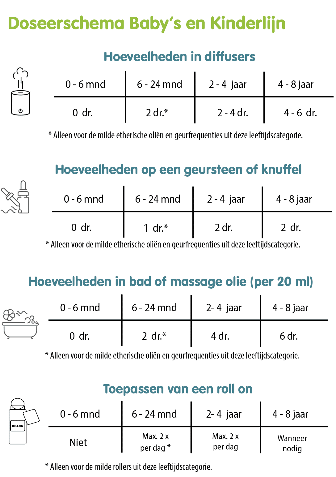 Onze kinderlijn is niet geschikt voor zeer jonge baby’s vanaf 6 maanden. Daarom hebben wij deze aparte, zachte geurlijn ontwikkeld die speciaal is afgestemd op de allerkleinsten. De concentratie etherische oliën is laag, waardoor het product veilig is bij normaal gebruik.